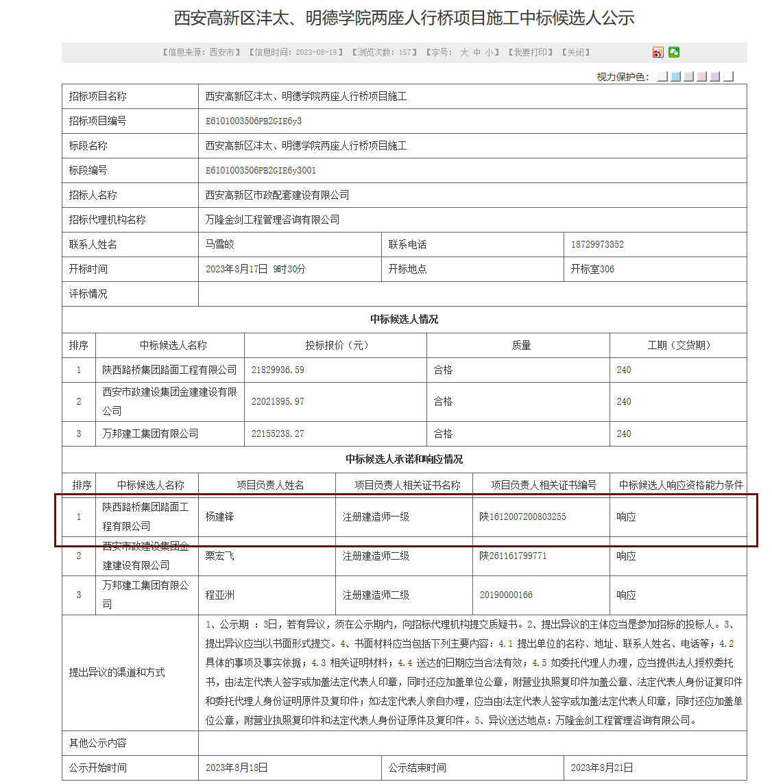 近日,陕西路桥集团路面工程有限公司成功中标西安高新区沣太、明德学院两座人行桥施工项目。中标金额2182万元,合同工期240天。