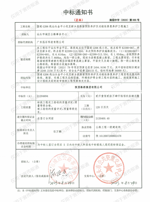 近日,陕西路桥集团有限公司成功中标国道G206线汕头金平小坑至新乡段路面预防养护及功能性修复养护工程,中标价2120万元,合同工期120天。